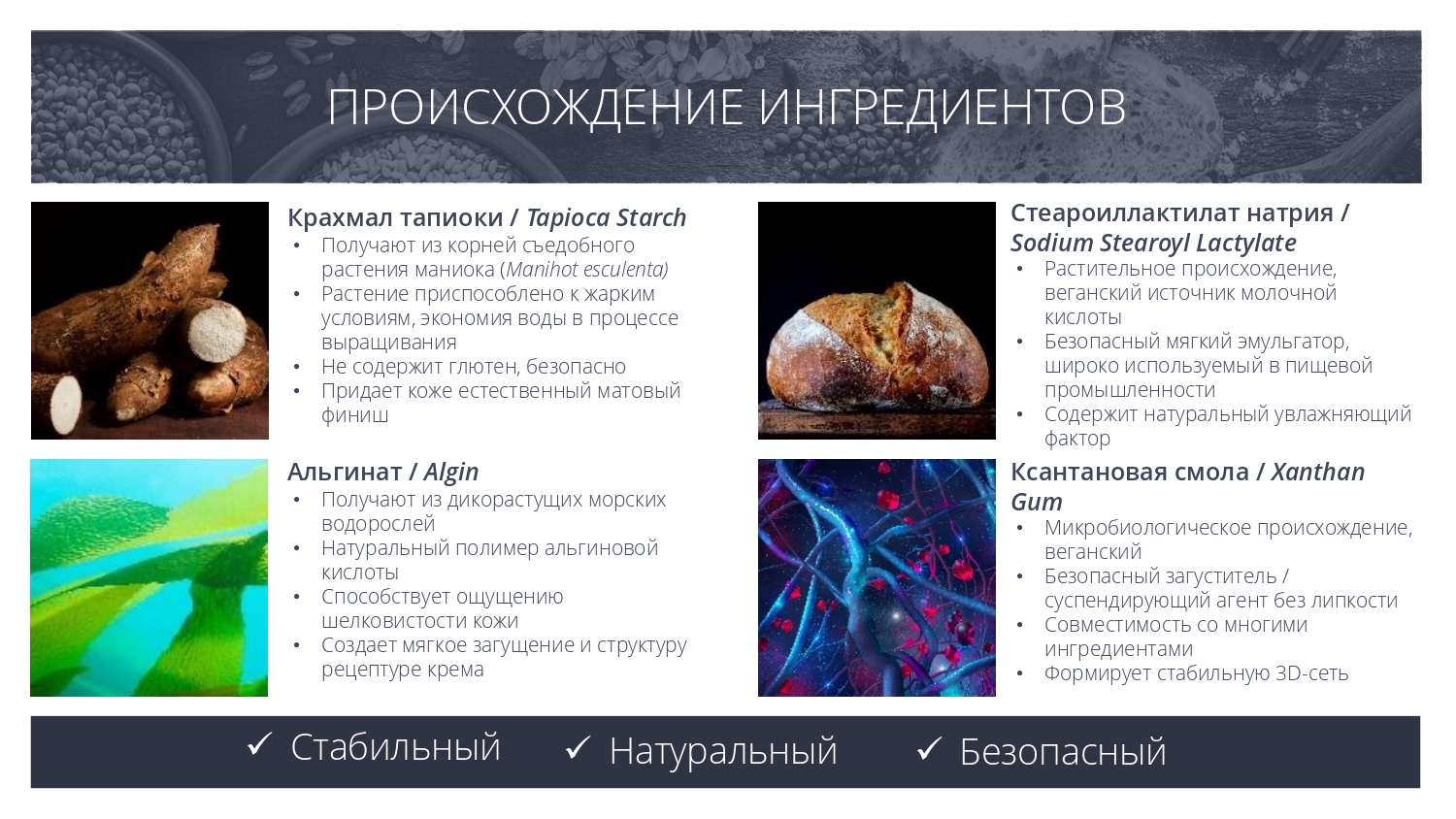 • Сатиновый матовый внешний вид, имитирующий ощущение силиконового эластомера – может заменить синтетические эмульгаторы / полимеры