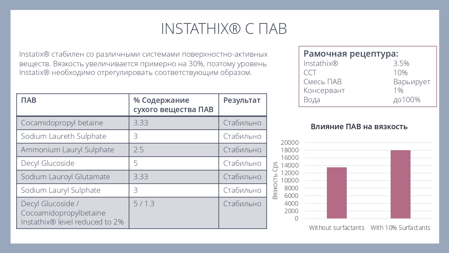 Instathix® представляет собой концентрированную порошковую смесь натуральных эмульгаторов, стабилизаторов и модификаторов текстуры, позволяющую легко получать стабильные эмульсий типа "масло-в-геле". С ним можно создавать как жидкие сыворотки с шелковистой гладкой текстурой, так и более насыщенные и густые кремы и баттеры. Кроме того, этот ингредиент можно использовать для решения проблем, связанных с повышением вязкости или улучшением стабильности и текстуры уже готовых рецептур.